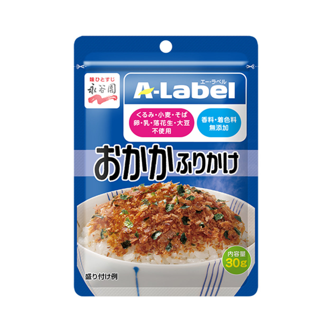 This is A-Label's bonito flake seasoning, made without "walnuts, wheat, buckwheat, eggs, milk, peanuts, or soybeans" and with no added "fragrances or colorings."